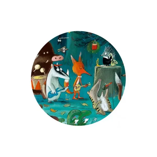 Un puzzle représentant une forêt dans laquelle les animaux jouent de la musique, vous y trouverez un renard jouant de la guitare, un hérisson jouant de l’accordéon, un lapin jouant du violon…
