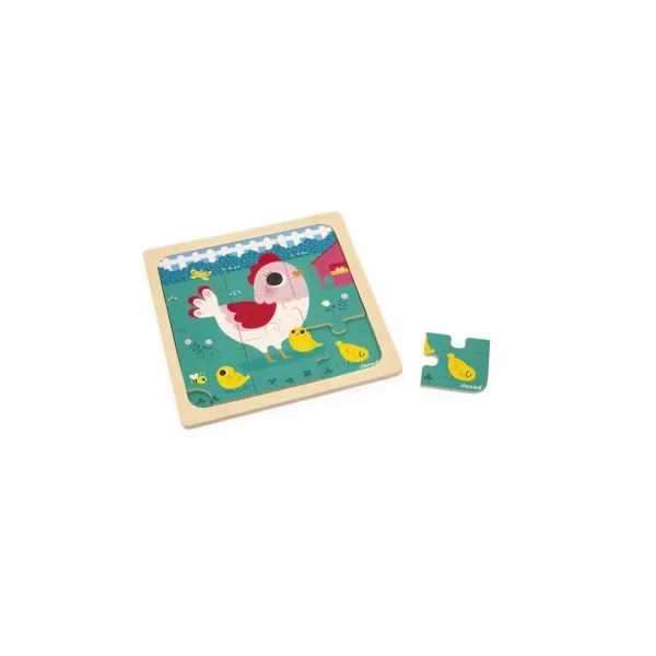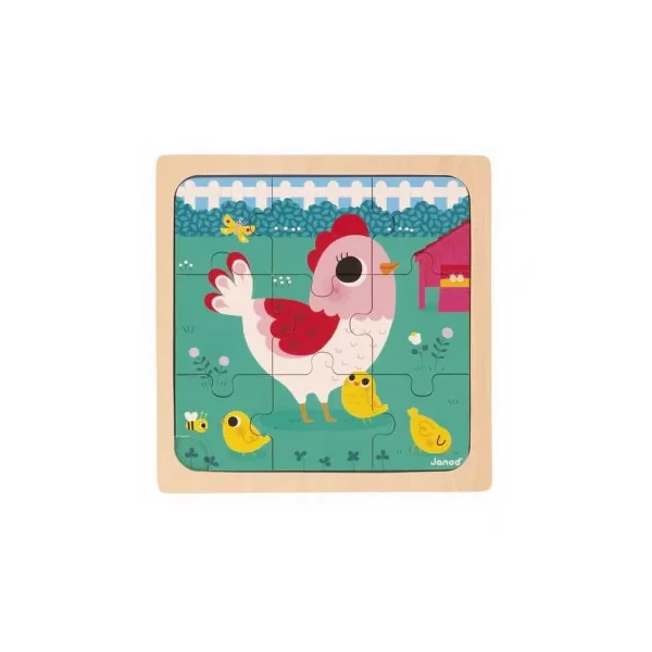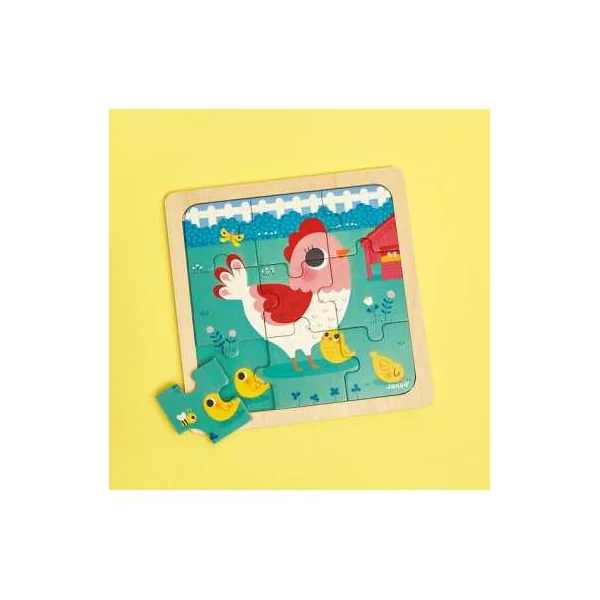 Découvrez le puzzle Poulette Henriette de Janodun puzzle en bois composé de 9 pièces, que les enfants dès 18 mois s’amuseront à replacer sur un plateau en bois.