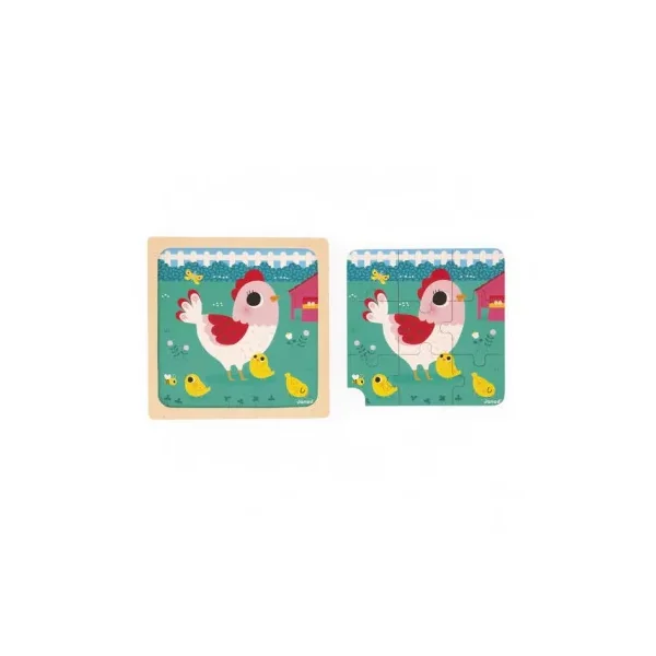 Un puzzle ludique avec une belle illustration sur le thème de la ferme : une poule et ses poussins. Le fond du puzzle aide l’enfant à le réaliser et il est étudié pour que les pièces soient faciles à attraper et à placer. Il possède également une encoche pour retirer les pièces facilement.