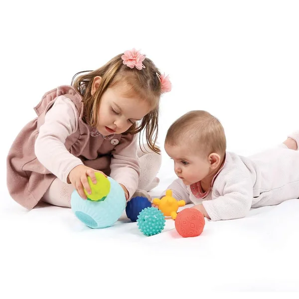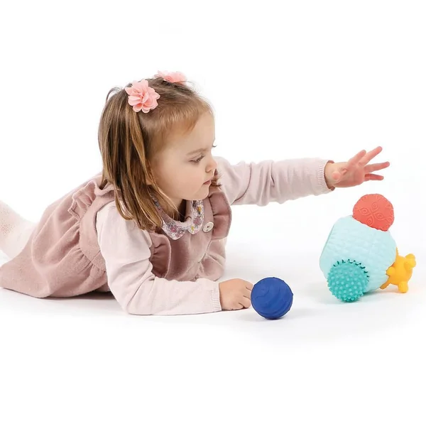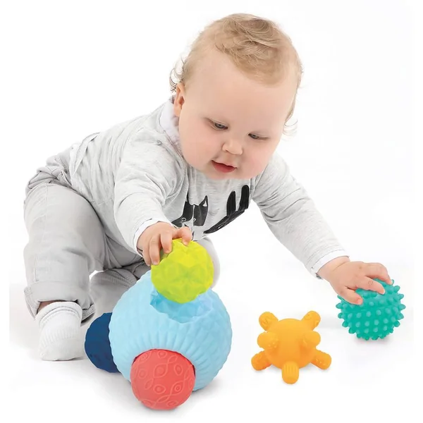 Adapté pour les enfants à partir de 6 mois, ce puzzle en 3 dimensions attire l’attention par son étrange allure et ses couleurs vives !Découvrez dans ce coffret un lot de balles sensorielles au toucher et aux couleurs différentes. 5 petites balles, faciles à la prise en main, s’imbriquent dans 1 grande balle pour toutes les assembler. Les enfants s’amusent à détacher les petites balles de la grande pour ensuite retrouver le bon emplacement. Attention à ce que les empreintes correspondent !Le puzzle multi balles permet aux enfants de reconnaître des formes, des couleurs et de recomposer un volume rigolo. Il entraine la mémoire, la logique mais également la motricité fine. Les balles sensorielles se prêtent à une multitude de jeux. Nervurées, lisses ou à picots, grandes ou petites toutes les balles stimulent le sens du toucher, la dextérité et la coordination des mouvements des enfants. Leur matière en plastique souple et léger est résistante aux mordillements et aux gestes brusques. Elle peut aussi aider bébé à soulager ses gencives lorsque ses petites dents poussent. De nombreuses occasions pour jouer, s’amuser et partager des moments de complicité en famille !Recommandées pour les bébés de plus de 6 mois.Diamètre des petites balles : ø 6,5 cm.Diamètre de la grande balle : ø 12 cm.Composition 100 % PVC.Lavable avec un chiffon humide.