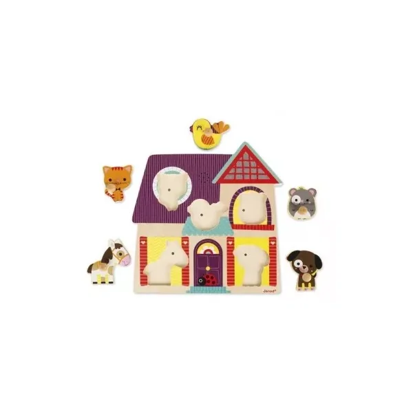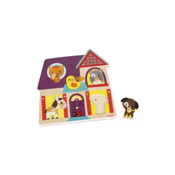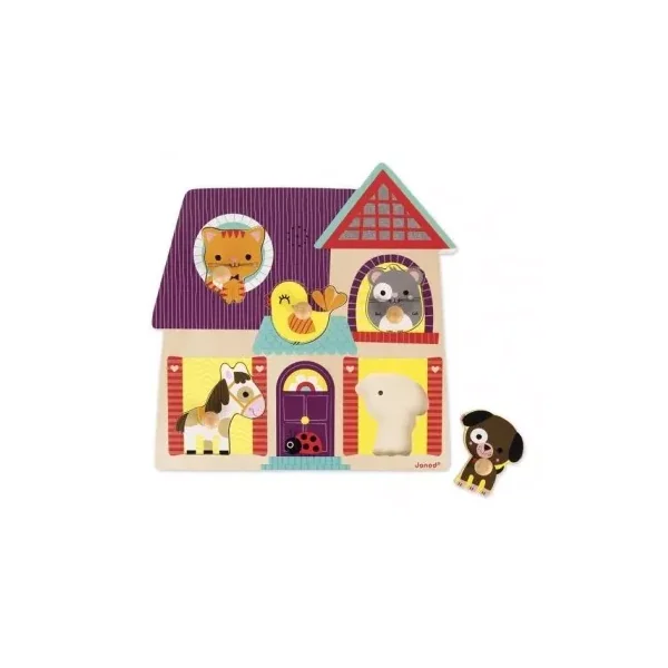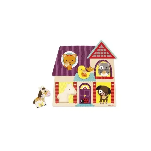 Découvrez le puzzle musical « mes petits compagnons » de Janod, un puzzle en bois de 5 pièces à tenons à encastrer, idéal pour les petits avec de grosses pièces pour découvrir les cris des animaux : souris, chat, poussin, chien et cheval. Un puzzle ludique de 18 mois à 3 ans.
