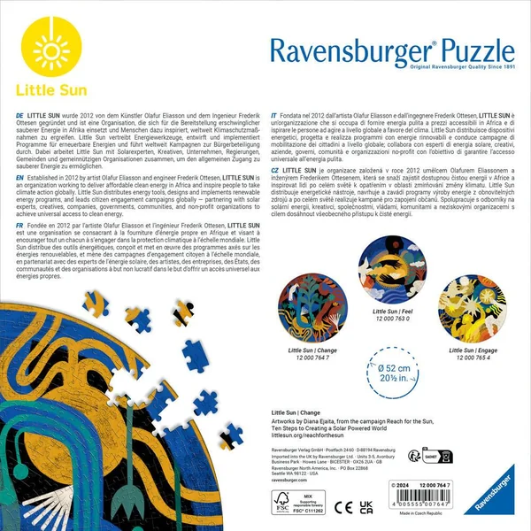 Découvrez cette nouvelle collection de puzzles au format rond inédit et aux illustrations fraîches et tendances idéale pour un moment de pure détente dans un tourbillon de couleurs ! Toujours avec la même qualité Ravensburger ! Les puzzles Ravensburger sont synonymes de plaisir et de qualité supérieure. Ils sont le fruit d’une expertise de plusieurs décennies dans la production de puzzles et d’une grande exigence en matière de matériaux, d’images et de design.