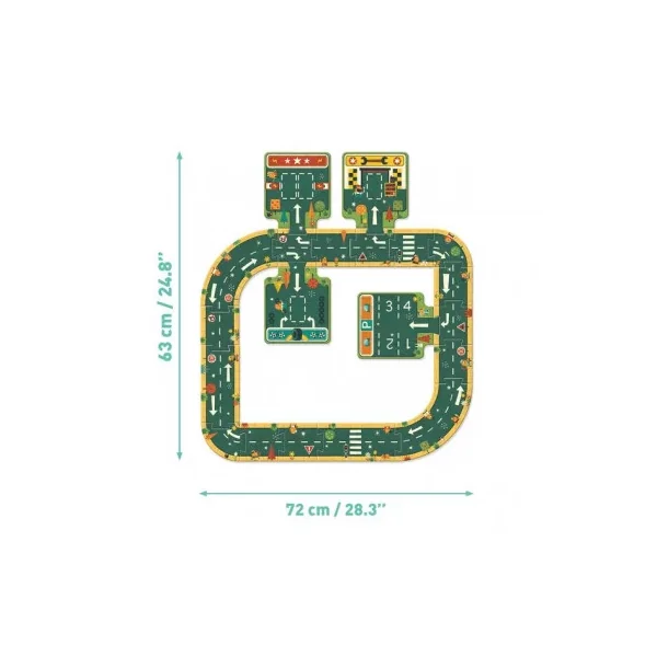 Un puzzle qui servira de décor pour s’inventer de belles histoires en y ajoutant des voitures, des camions, des animaux ou des personnages. En route!