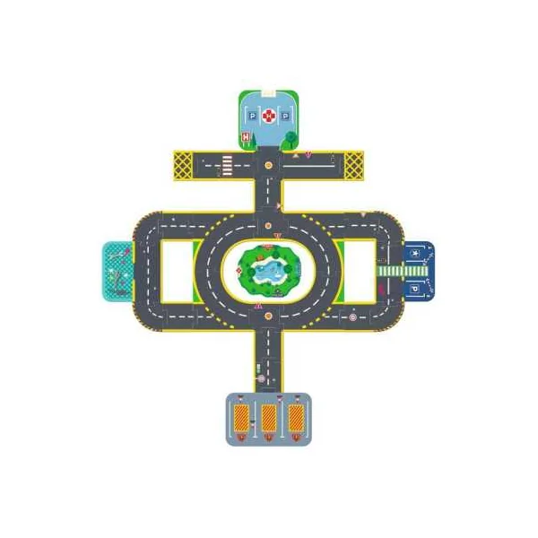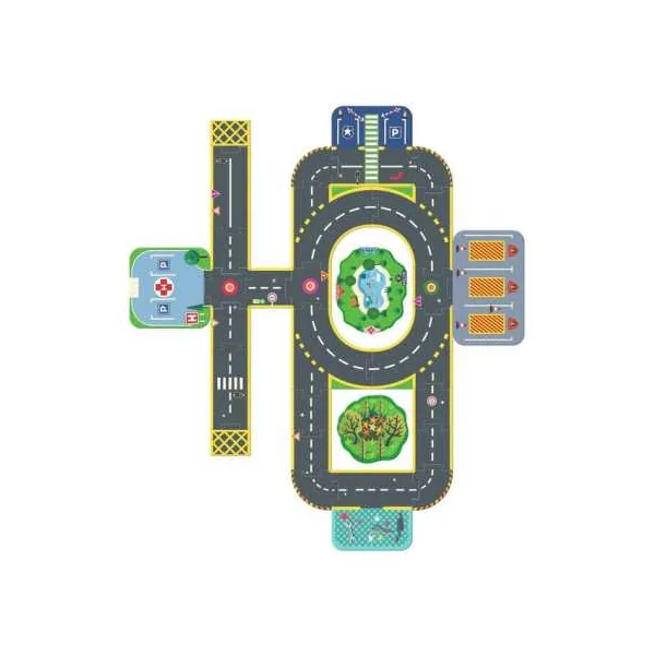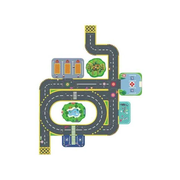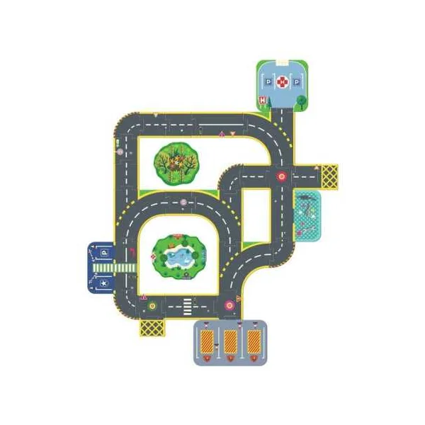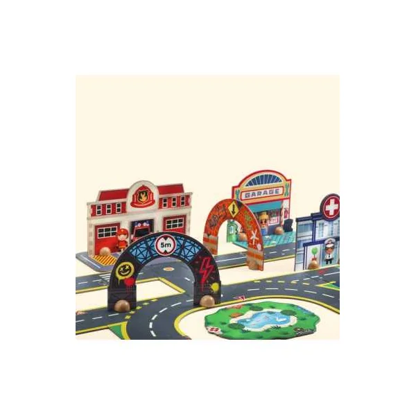 Un puzzle de sol complété par des éléments de décors montés sur des socles en bois pour jouer et se raconter des histoires. Une ville géante composée de 27 pièces de sol et de 6 éléments de décors incluant un hôpital, un poste de police, un garage, une caserne de pompiers et deux arches.