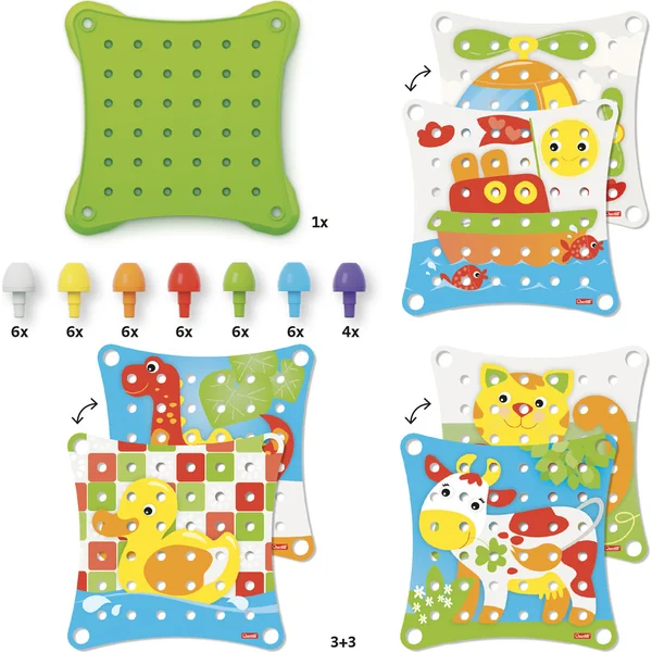 Excellente mosaïque didactique destinée aux enfants à partir de 2 ans. De grandes pinces colorées et empilables incitent à créer les premières mosaïques ou à construire de hautes tours. Un excellent jeu qui stimule la créativité et l’habileté manuelle.