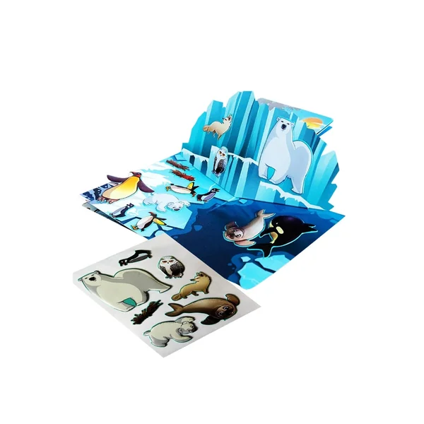 In addition to the water reveal pages, the playbook includes a double-sided fold-out section adorned with reusable stickers. These stickers, featuring a variety of colorful animals and characters, can be repositioned to create different scenes and stories. This aspect of the playbook promotes imaginative storytelling and role-playing, allowing children to explore various scenarios and environments. The reusable nature of the stickers means that children can continually reinvent their play, making each experience unique and exciting.