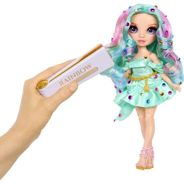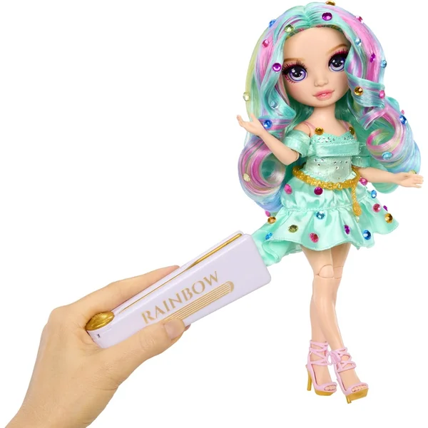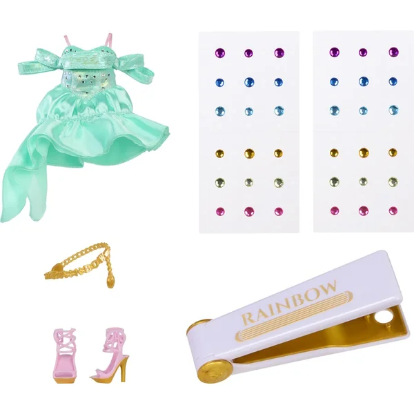 Le paquet comprend des paillettes en cristal arc-en-ciel, que tu peux utiliser pour décorer les cheveux et les vêtements des poupées – et n’hésite pas à les essayer sur toi-même. Avec l’outil de crimping Rainbow High, tu peux facilement appliquer les cristaux scintillants et transformer chaque coiffure et tenue en une œuvre d’art arc-en-ciel éblouissante.