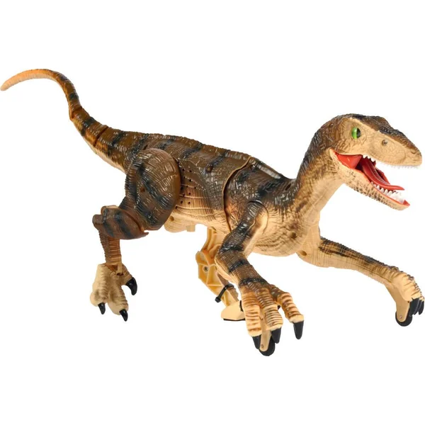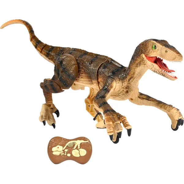 Dinosaure radio commandé Rapetosaurus. Reproduction d’un Vélociraptor (anatomie générale, aspect de surface de la peau, griffes, yeux, gueule et dentition). Démarche reproduite par la cinématique des pattes arrière. Corps et queue articulés. Déplacements stables (Revêtement antidérapant). Effets sonores (grondements) et lumineux (LED à l’intérieur de la gueule). Radiocommande 2,4 GHz (Style Fossile Jurassique). Marche avant/arrière, directions gauche/droite. Livré avec 1 accu Li-Ion 3,7 V et chargeur USB.