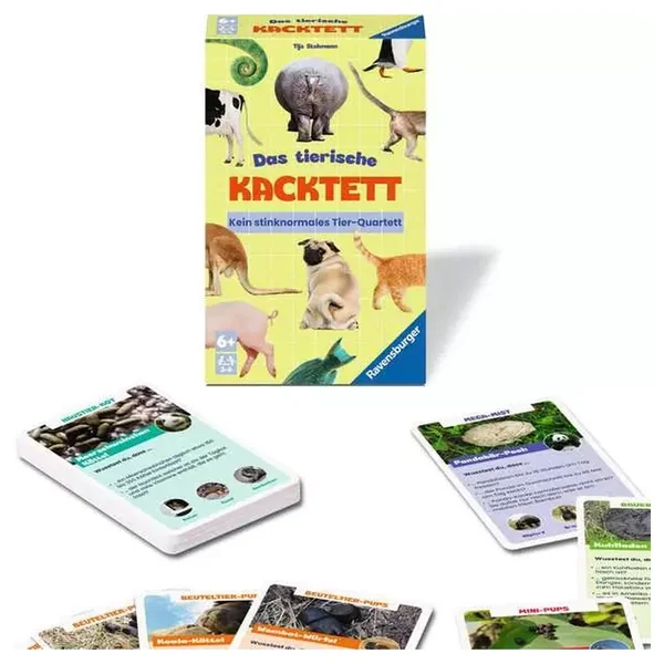 Ravensburger Das tierische Kacktett invites players into a hilarious and educational journey through the animal kingdom. This game follows classic Quartet rules, allowing players to collect sets of four cards while discovering quirky facts about animal droppings. With illustrations that capture attention and humor, it reveals how different animals utilize their waste in surprising ways, such as vultures using droppings as soap and wombats producing cube-shaped poop.