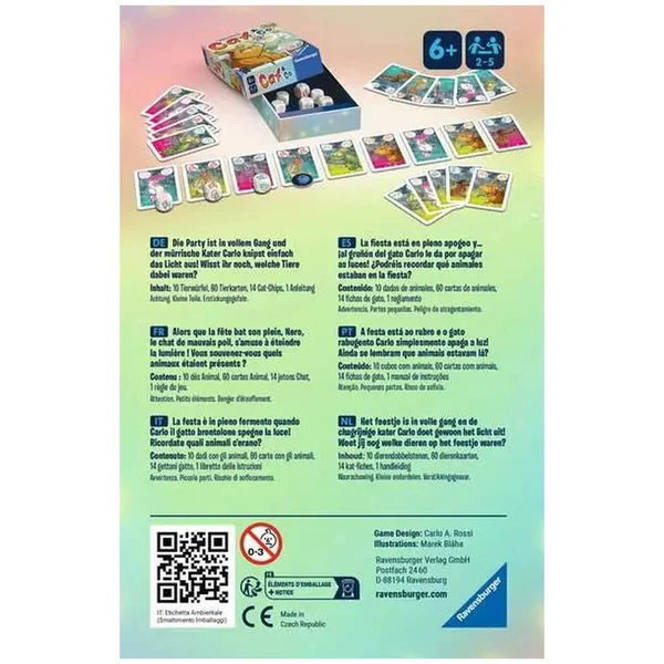 Introducing the Ravensburger – Cat & Co. Board Game, an engaging and entertaining experience designed for players of all ages. This delightful game invites you to join a lively party where the mischievous cat, Carlo, has a knack for turning off the lights just when the fun is at its peak. As players, your challenge is to remember which animals were part of the celebration, making it a perfect blend of memory and strategy. With multi-language instructions available in Italian, German, French, Dutch, Spanish, and Portuguese, this game is accessible to a wide audience, ensuring everyone can join in on the fun.