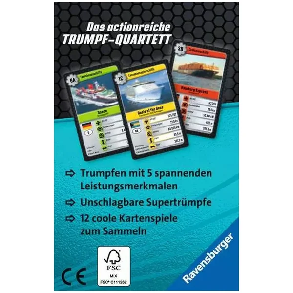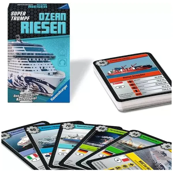 Introducing the Ravensburger Super Trump Ocean Giants Board Game, a captivating card game designed for enthusiasts aged seven and up. This German edition of the popular Supertrumpf series offers an engaging blend of fun and education, making it an ideal gift for young players and adults alike. With its focus on ocean giants, this game invites players to explore the fascinating world of marine vessels through vibrant illustrations and intriguing facts.