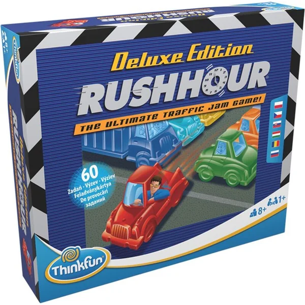 Le jeu Rush Hour en édition Deluxe a été amélioré pour offrir une expérience de jeu maximale. Tout cela grâce à 60 défis spécialement sélectionnés dans cinq niveaux de jeu allant des débutants aux grands maîtres et grâce à des voitures stylées dans des teintes métalliques !
