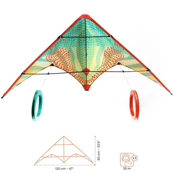Red Dots est un cerf-volant pilotable grâce à ses 2 lignes. Il permet de s’initier au déplacement dans les airs et au plaisir de découvrir de premières figures acrobatiques. Dimension : 120 x 60 cm.