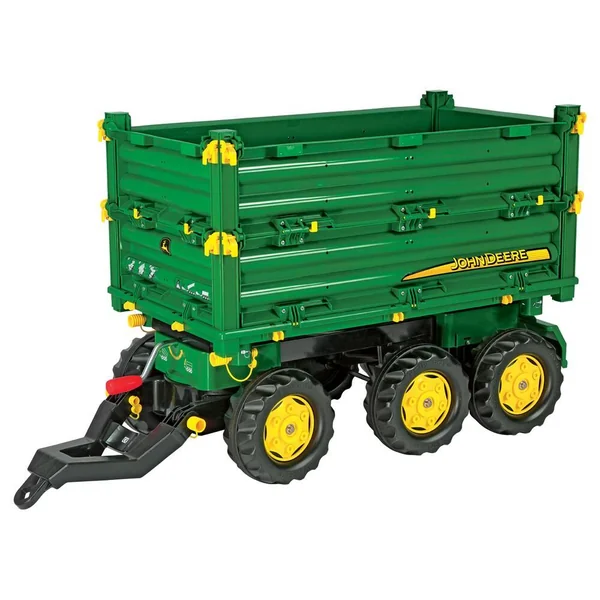 Remorque John Deere de ferme à triple essieu, basculante sur trois côtés, haute capacité de charge, tous les bordages sont très faciles à faire basculer et à démonter, un simple déplacement de 2 tourillons de sécurité permet le basculement sur 3 côtés avec levier croisé par manivelle. Garantie 3 ans. Elle convient aux enfants de 3 à 10 ans.
