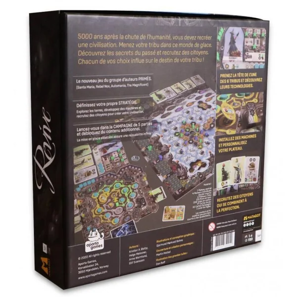 Faites revivre la civilisation, 5000 ans après que tout ait été détruit. Dirigez votre tribu et explorez la terre gelée. Exploitez ses ressources. Recrutez les survivants de la surface pour votre cause. Construisez des usines avec des machines puissantes et peuplez d’anciens sites pour redécouvrir les technologies oubliées de votre tribu. 1 plateau – 35 tuiles Plateau – 28 marqueurs d’énergie -106 jetons – 21 tuiles Artefacts – 2 cubes d’action – 30 cartes campagne – 39 cartes Citoyen – 4 plateaux Joueur – 6 plateaux Tribu