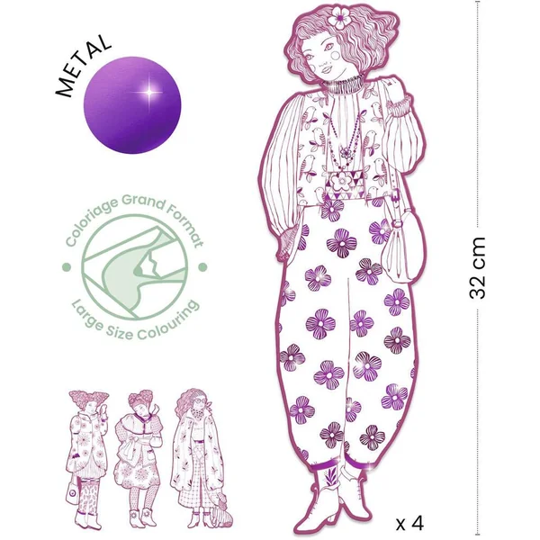 Un défilé de demoiselles aux tenues chamarrées à colorier au gré de sa fantaisie ! Quatre grandes silhouettes de 32 cm de haut présentent des tenues riches en motifs et agrémentées de zones brillantes pour donner encore plus d’allures aux modèles !