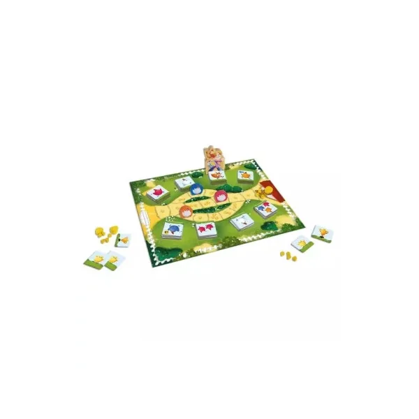 La boite de jeu contient 1 plateau, 3 poules en bois, 1 pion en bois, 30 grains en bois, 48 tuiles « Action » et 9 tuiles « Pari ».