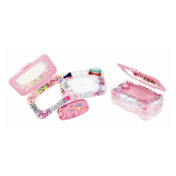 The jewelry box itself is a charming, transparent pink case featuring a convenient handle for easy transport. It includes a built-in mirror, allowing children to admire their creations as they wear them. With two levels of compartments, this jewelry box keeps all materials organized and easily accessible, making the crafting process smooth and enjoyable. This thoughtful design ensures that everything needed for creativity is right at hand, promoting a clutter-free crafting experience.