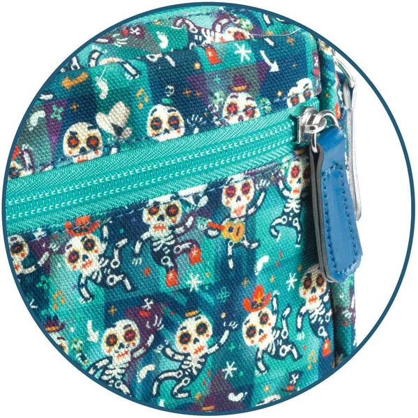 Un sac banane illustré sur le thème des squelettes avec une grande poche centrale et une petite poche sur le devant. L’enfant peut le porter en bandoulière ou à la taille en fonction de son style.