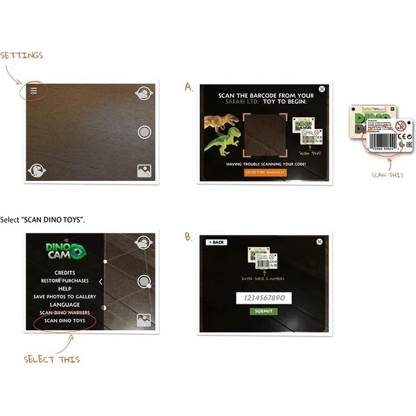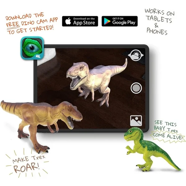 Avec votre téléphone, vous pouvez scanner le code QR sur l’étiquette de la figurine, télécharger l’application Dino Dana et scanner le code-barres de la figurine pour interagir avec ce T-Rex dans un environnement de réalité augmentée !