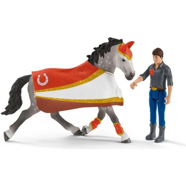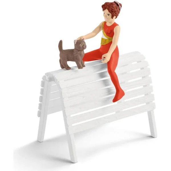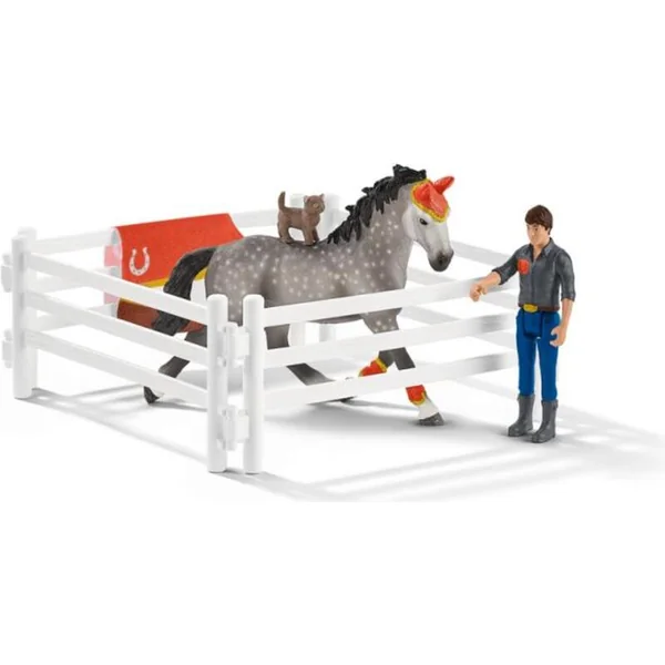 La petite fille Mia peut se préparer parfaitement pour sa première compétition avec le set de voltige de Schleich® Horse Club. L’instructeur d’équitation, Tom, calme les chevaux et fait doucement claquer le fouet qu’il tient dans sa main, de sorte que le cheval court uniformément en cercle à l’intérieur de la clôture, qui peut être assemblée selon les besoins. Mia, la sœur de Hannah, a des bras mobiles et peut tenir un grand trophée doré. La selle, le bridon et la couverture peuvent être démontés et sont rangés sur le banc de rangement après l’entraînement. Un petit chat brun observe les événements avec intérêt et se blottit ensuite dans son panier douillet. Les figurines Schleich® sont toutes modélisées dans les moindres détails, peintes avec soin et encouragent les enfants à jouer tout en apprenant.