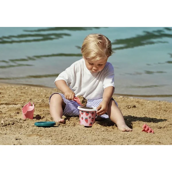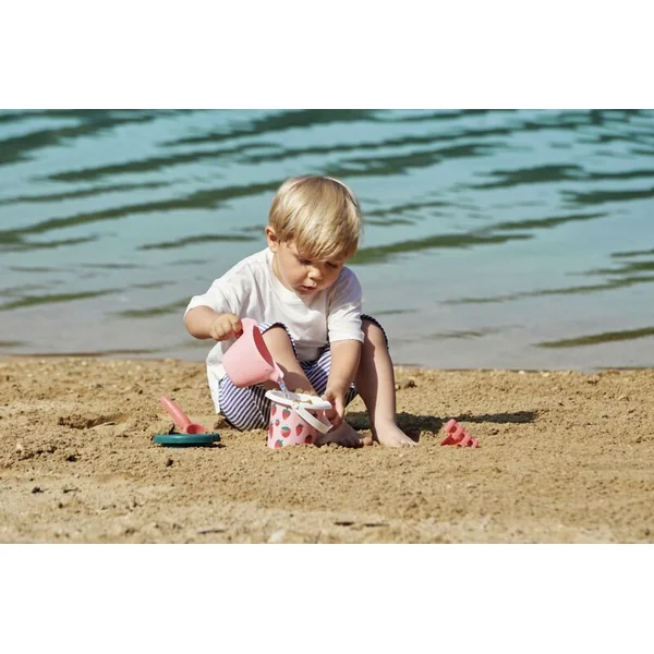 Seau avec motif de fraise, accompagné d’un arrosoir, d’un tamis, de râteaux et d’une pelle.