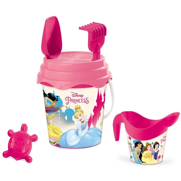 Seau décoré aux couleurs des PRINCESSES DISNEY, garni avec une pelle, un râteau, un tamis, un moule et un arrosoir. Idéal pour s’amuser à la plage. Diamètre : 17 cm.