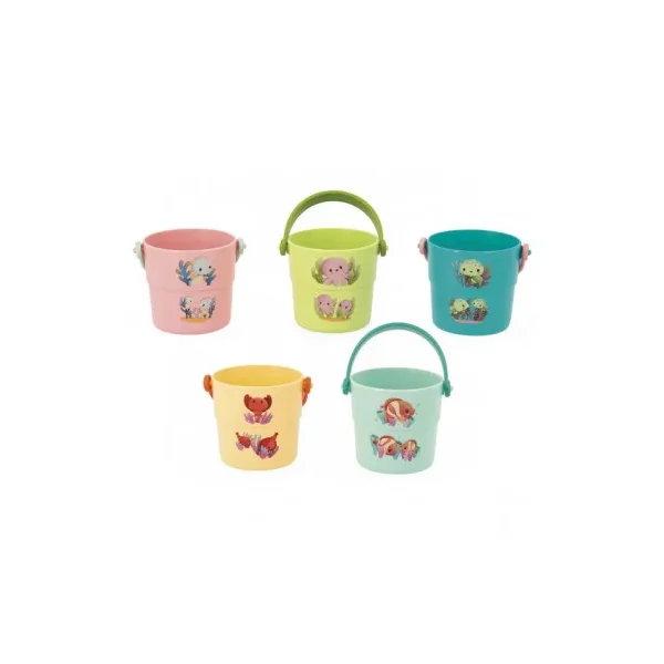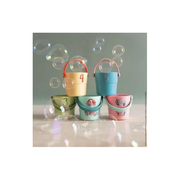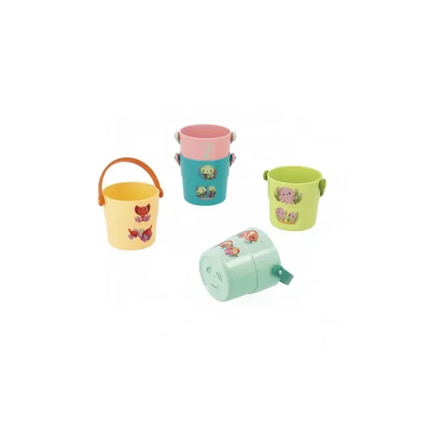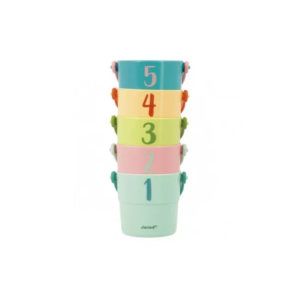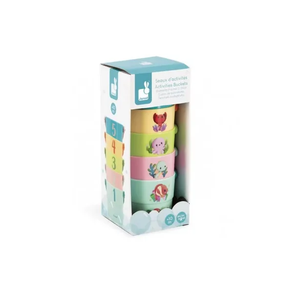 Découvrez le coffret Seaux Mes bébés animaux de Janod, un jouet de bain composé de 5 seaux colorés et illustrés pour amuser votre enfant dans le bain dès 10 mois.