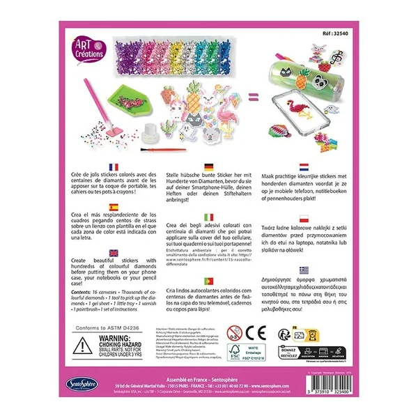 Introducing the Sentosphere Stickers à Diamanter, an innovative arts and crafts kit designed to inspire creativity and artistic expression in individuals of all ages. This engaging product allows users to create over 15 stunning stickers by applying thousands of colorful diamonds to beautifully patterned canvases. Whether you want to personalize your phone case, decorate notebooks, or embellish pencil holders, these dazzling stickers are the perfect way to add a touch of sparkle to your everyday items.