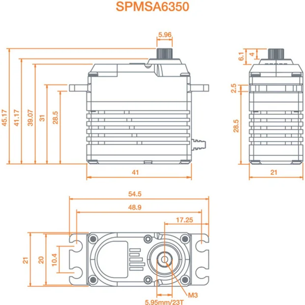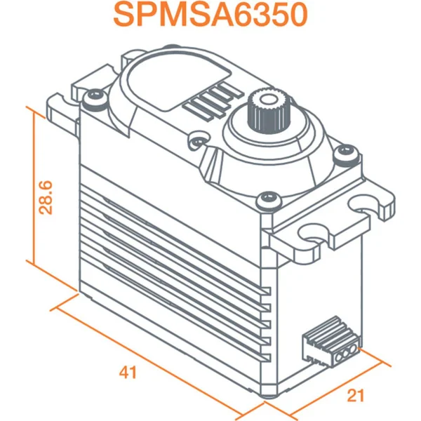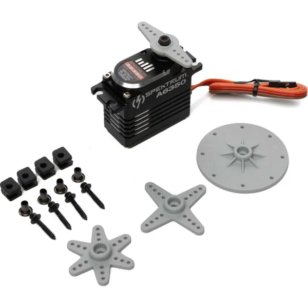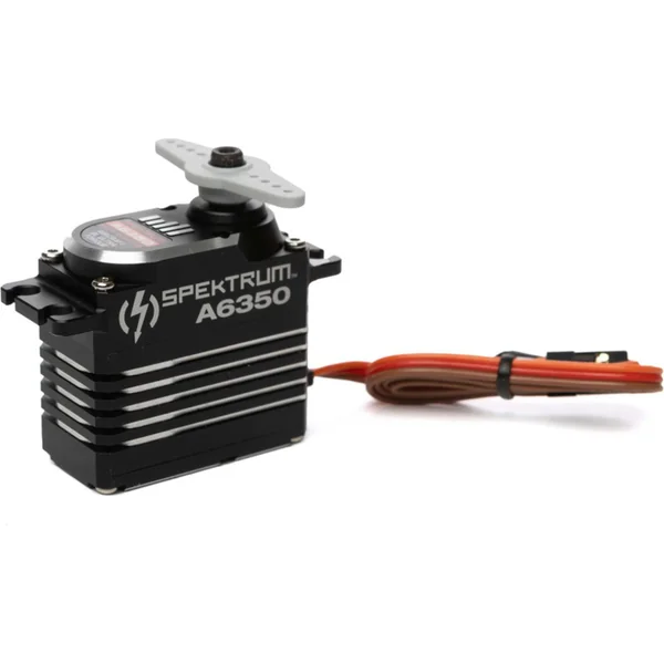 Servo numérique Spektrum A6350 ultra puissant et rapide avec moteur brushless pour de grands modèles RC d’avions, acrobatie 3D. Engrenages en métal, boîtier entièrement en aluminium, roulements doubles, alimentation 6V – 8,4V, couple 41 – 61kg/cm, vitesse 0,14-0,09 s/60°, poids 85g, dimensions 40x20x40mm, hexagone 23T.