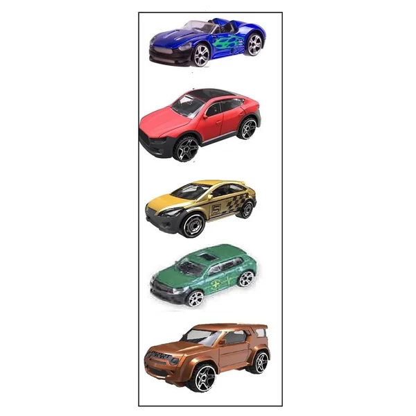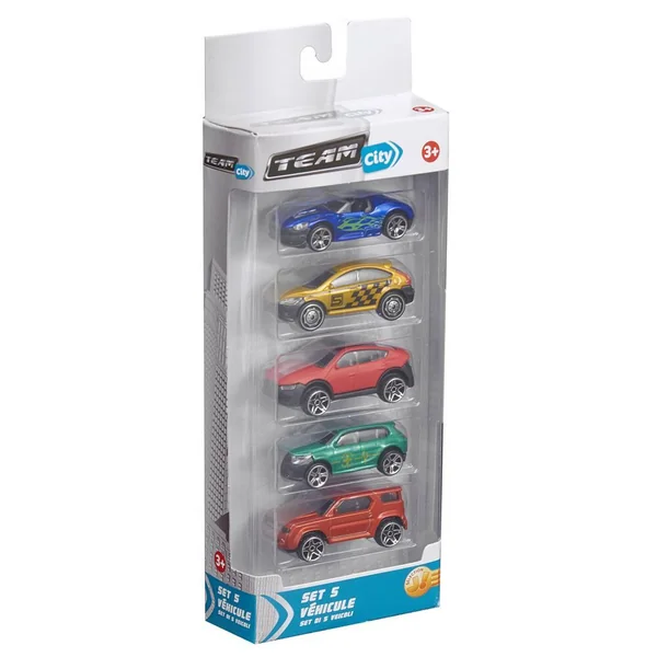 Echelle 1/64ème. Set contenant 5 véhicules roues libres Die-Cast : en métal et plastique. Longueur d’un véhicule : environ 7.5 cm.