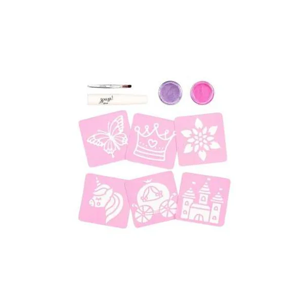 Découvrez le set de tatouages glitter Princesse de Souza, un coffret cadeau de maquillage pour les enfants à partir de 6 ans où vous allez réaliser des tatouages avec des pochoirs sur le thème des princesses.