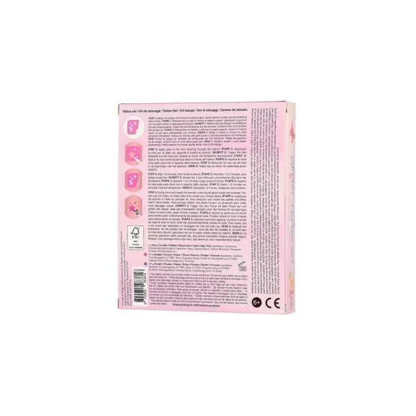 Un très beau coffret de tatouages à offrir en cadeau qui contient un pinceau, un tube de colle, 2 poudres de tatouages et 12 pochoirs.