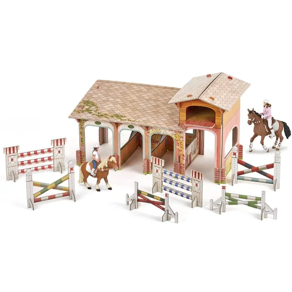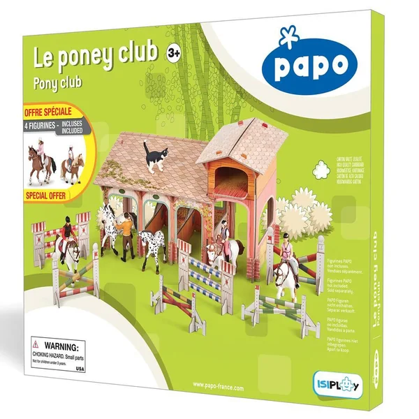 Le poney club Isiplay est le décor idéal pour les passionnés d’équitation ! Des heures de jeu en perspective pour soigner les chevaux et poneys, partir en balade à travers champs, participer à des concours de saut d’obstacles ou encore des cours de dressage. Le poney-club PAPO est un environnement ludique en carton de qualité, à monter soi-même (31 pièces).