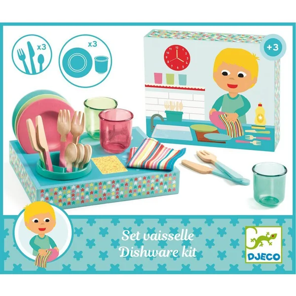 Le set comprend couverts, verres et assiettes, tous rangés dans une boîte ingénieuse qui se transforme en égouttoir : après avoir lavé la vaisselle, l’enfant peut tout ranger en jouant et faire comme les grands… en s’amusant !