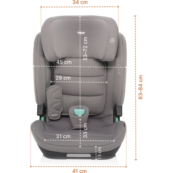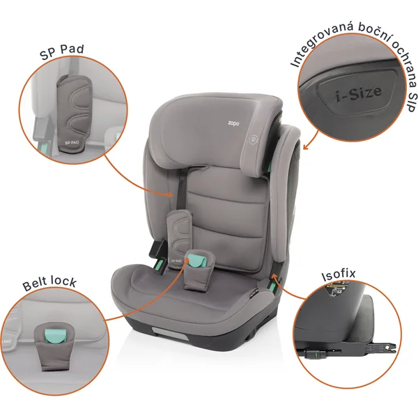 En cas de collision frontale, le siège auto est équipé de SP PAD, qui réduisent la charge sur la tête, la colonne cervicale et la poitrine. La fonction Belt Lock ajoute 4 points lors de l’attache et réduit ainsi la pression sur le ventre de l’enfant en cas de collision frontale. La protection latérale intégrée SIP sur toute la longueur protège l’enfant également dans la partie inférieure. Le respect de la dernière norme i-SIZE garantit la sécurité tout au long de l’utilisation.