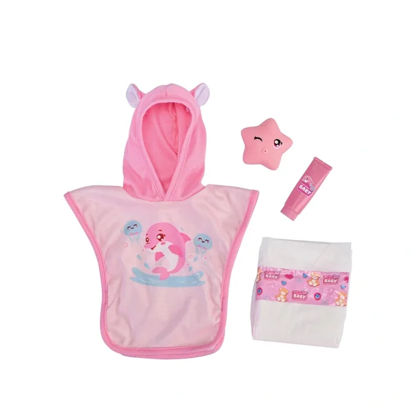 • Cuddly Bath Poncho: Includes a soft pink hooded robe decorated with a dolphin, ideal for keeping dolls warm after a bath.