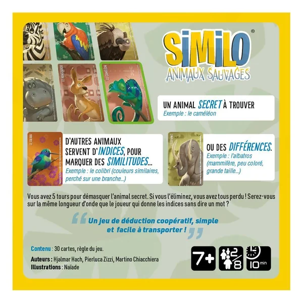 Votre but est de faire deviner aux autres joueurs un animal secret (parmi les 12 au centre de la table). Pour cela d’autres cartes de votre main vous serviront d’indices. Vous avez 5 tours pour démasquer l’animal secret. Si vous l’éliminez par erreur vous avez tous perdu ! Serez-vous sur la même longueur d’onde que le joueur qui donne les indices sans dire un mot ? Similo Animaux sauvages est un jeu de déduction coopératif dans lequel les joueurs doivent retrouver l’animal secret du narrateur à l’aide d’autres animaux. Similitudes, différences, à vous de deviner ce que le narrateur essaye de vous indiquer. Est-ce un animal à écailles ? Un prédateur ? Un animal qui vient du même endroit ? A-t-il le pelage de la même teinte ? Autant de questions auxquelles vous devrez trouver réponse. Il est possible de combiner les 2 boîtes Animaux et Animaux sauvages pour encore plus de plaisir ! Une boîte pour les animaux à découvrir et une autre boîte pour les animaux indices. Nombre de joueurs 2-8. Durée de la partie 30 minutes.
