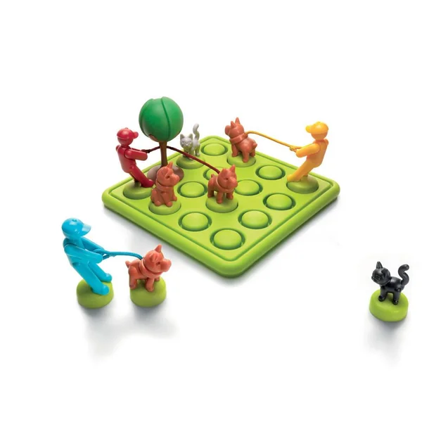 Découvrez le jeu Les chiens s’en mêlent de Smartgames, un jeu de logique où vous devrez réaliser 80 défis évolutifs à partir de 7 ans. Soyez le meilleur maître possible, en évitant les aboiements et les miaulements! Le but du jeu est de compléter le plan de jeu en évitant que les chiens ne s’emmêlent. Le jeu contient 1 plan de jeu, 1 arbre, 4 chiens, 3 maîtres, 2 chats, un livret de 80 défis avec les solutions.