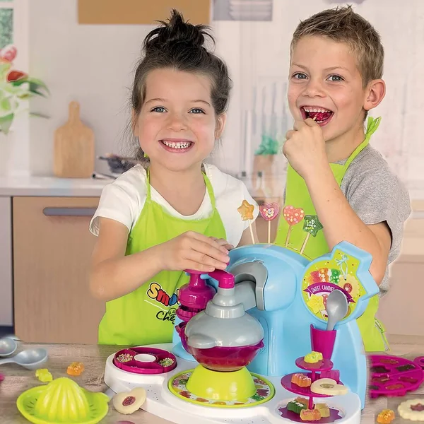 Playset complet pour réaliser des bonbons, des gâteaux vitraux et des sucettes en s’amusant. Nombreux accessoires inclus : 1 bol avec couvercle et fouets intégrés, 20 pics à sucettes, 1 seringue avec 3 embouts, 1 grosse cuillère, 3 cuillères doseuses, 1 moule à bonbons en silicone, 1 emporte pièce éjecteur avec 3 formes différentes : coeur/petit biscuit/tartelette, 1 livre de recettes, 1 présentoir pour