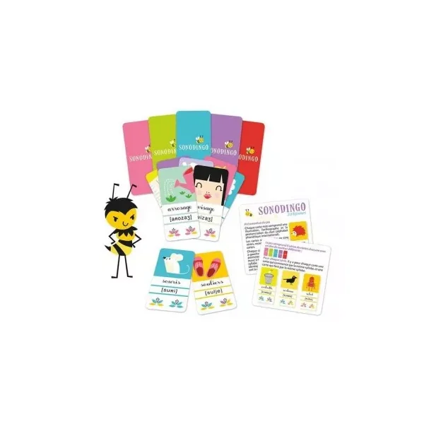 Composé de 102 cartes mots, Sonodingo est un jeu évolutif avec 5 niveaux différents. Pour chaque carte, il existe une carte qui commence par la même syllabe et une autre qui finit par la même syllabe.