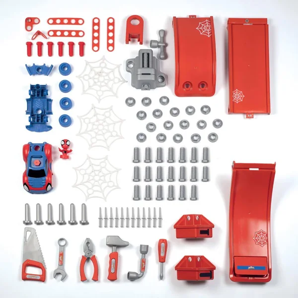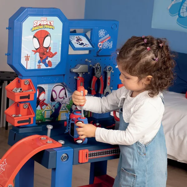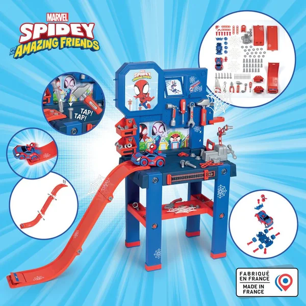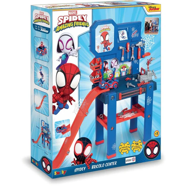 Etabli Bricolo Center Spidey et ses amis extraordinaires avec piste de lancement à construire soi-même. Composé de nombreux accessoires : 2 bacs de rangement, 6 outils (1 scie, 1 marteau, 1 clé à pipe, 1 clé plate, 1 tournevis, 1 pince), 6 règles de construction, 1 règle mécanique, 20 vis, 6 clous, 18 écrous, 4 pneus, le véhicule de Spidey à construire, le demi personnage de Spidey, des toiles d’araignées, 1 étau, 12 supports outils – Plusieurs fonctions de jeu : – Construire sa propre piste de lancement – Assembler la voiture de Spidey – Faire sauter la voiture grâce au tremplin – Jouer avec le tape tape clou – Hauteur du plateau : 53 cm –