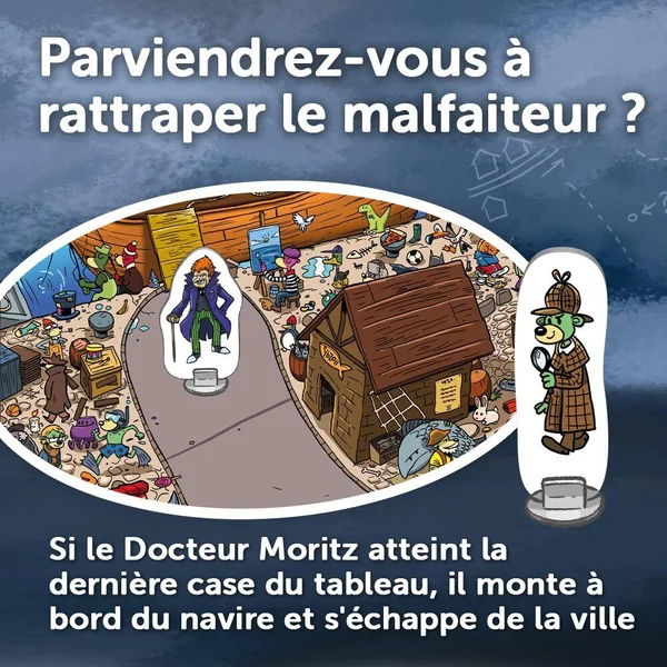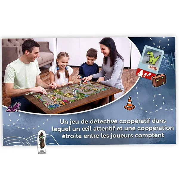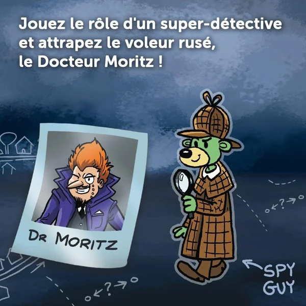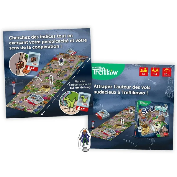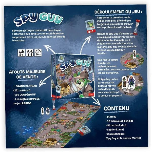 Spy Guy est un jeu coopératif et familial, où tous les joueurs unissent leurs forces pour traquer les objets dissimulés sur le plateau. Chaque tour, une carte Indice révèle l’objet à retrouver : fouillez la ville, repérez-le le plus de fois possible et marquez vos découvertes avant que le sablier ne s’écoule. Plus vous trouvez d’indices, plus Spy Guy se rapproche du voleur. Mais attention : à chaque tour, le Docteur Moritz prend aussi la fuite… Serez-vous assez rapides pour l’arrêter à temps ? Nombre de joueurs 1 à 4 – Durée de la partie 30 minutes.