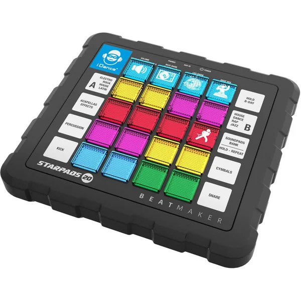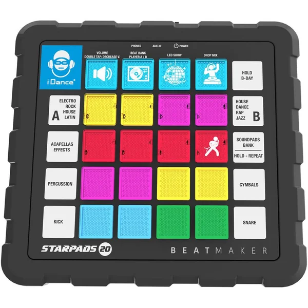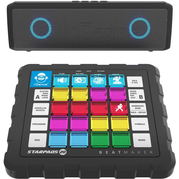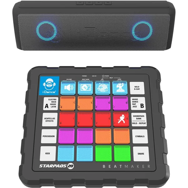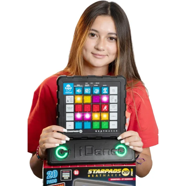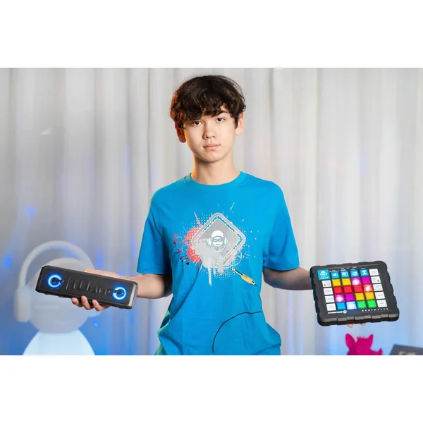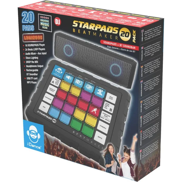 Le STARPADS-20 inclut une table de mixage dotée de 16 pads, deux beats player, un mixeur audio, et un éclairage disco pour ajouter une ambiance festive à chaque session. Sa barre de son Bluetooth rechargeable permet une connexion facile à votre musique préférée, rendant chaque mixage unique et inoubliable. Avec la fonction « drop the mix », les possibilités de création musicale sont infinies.