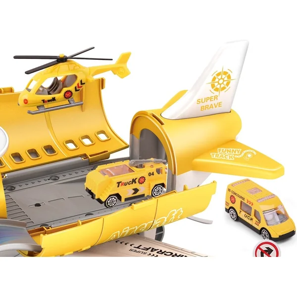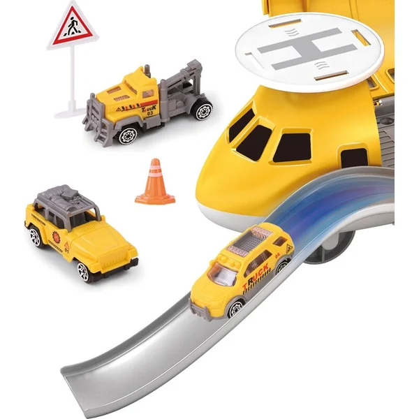 Contient une station d’avion, 4 petits véhicules, une piste, un héliport, des panneaux, des cônes. Image à assembler sur le côté de l’emballage.