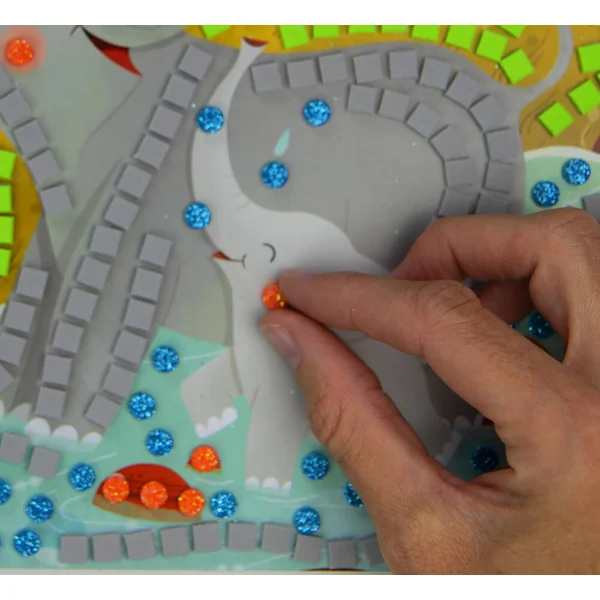 3 planches à décorer, 3 supports d’accroche mural, 1000 mosaïques colorées, gems et 1 notice.