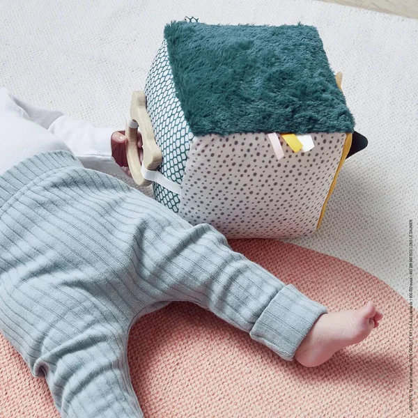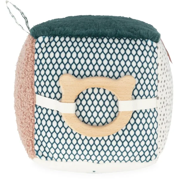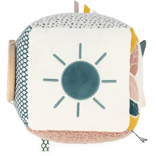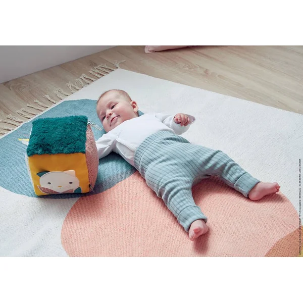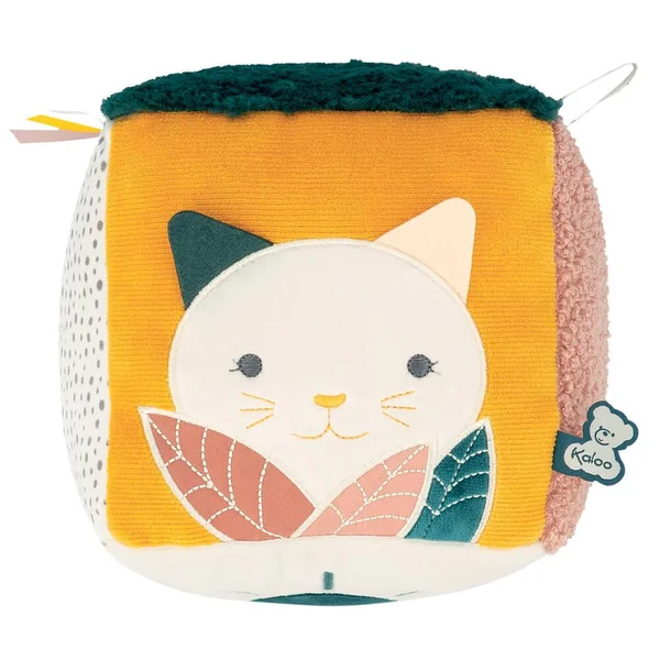 Développé en collaboration avec des psychomotriciens, ce cube sensoriel de 17 cm est idéal pour éveiller en douceur les sens de bébé tout en l’amusant. Le cube sensoriel, doux et moelleux, peut être attrapé et manipulé facilement. Ses nombreuses faces aux multiples matières, textures et couleurs permettent de développer plus particulièrement le toucher de bébé. L’ajout de la pièce en bois chat, le papier bruissant et les rubans sont autant d’éléments qui participeront à son éveil sensoriel. Ce cube sensoriel est idéal pour développer les sens de bébé ainsi que sa curiosité. Points forts : – Des tissus avec différentes textures pour développer le sens du toucher de bébé – Des couleurs et imprimés contrastés pour une meilleure perception des contrastes – Des rubans et un chat en bois pour développer sa préhension – Du papier bruissant pour développer son ouïe Découvrez d’autres produits de la gamme Stimuli de Kaloo pour accompagner votre enfant tout au long de son développement à travers des jeux dits sensori-moteurs sur notre site internet.