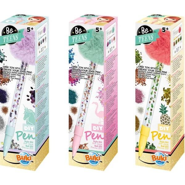 Remplis le stylo avec des paillettes, des sequins et des microperles puis ajoute de l’eau ! Ajoute un pompon tout doux pour égayer ton stylo. Plusieurs formes et couleurs sont proposées dans le kit pour que créer un stylo unique. La quantité fournie permet de recommencer plusieurs fois ! 2 mines de rechange incluses. 3 modèles disponibles : licorne, flamant rose et ananas.