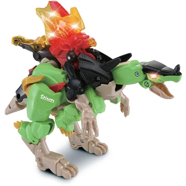 Switch & Go Dinos Combo – Spinops, le super spinosaure 2 en 1 – 4 ans + Un super spinosaure et son armure à assembler et animer ! Un tricératops articulé et une moto à combiner pour créer une toute nouvelle espèce de dinosaure avec une super armure lumineuse ! Deux modes de jeu : mode Dino et mode Dino Armure. Chaque mode se déclenche automatiquement lorsque la transformation est effectuée. Le bouton Action sur le dos du tricératops déclenche des effets sonores et lumineux. En mode Dino Armure, le bouton permet d’illuminer la voile dorsale du Spinosaure pour des effets lumineux encore plus spectaculaires ! La queue du dinosaure se déplace pour articuler la tête et donner vie à Spinops. Plus de 50 phrases et effets sonores réalistes. Arrêt automatique et réglage du volume sonore. Fonctionne avec 1 pile LR6 fournie.