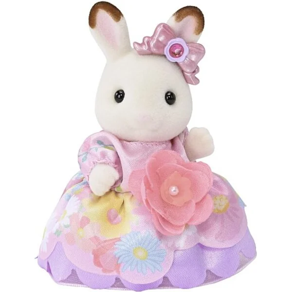 Freya de la famille des lapins en chocolat porte une robe avec une grande fleur rose et a mis un nœud sur son oreille.